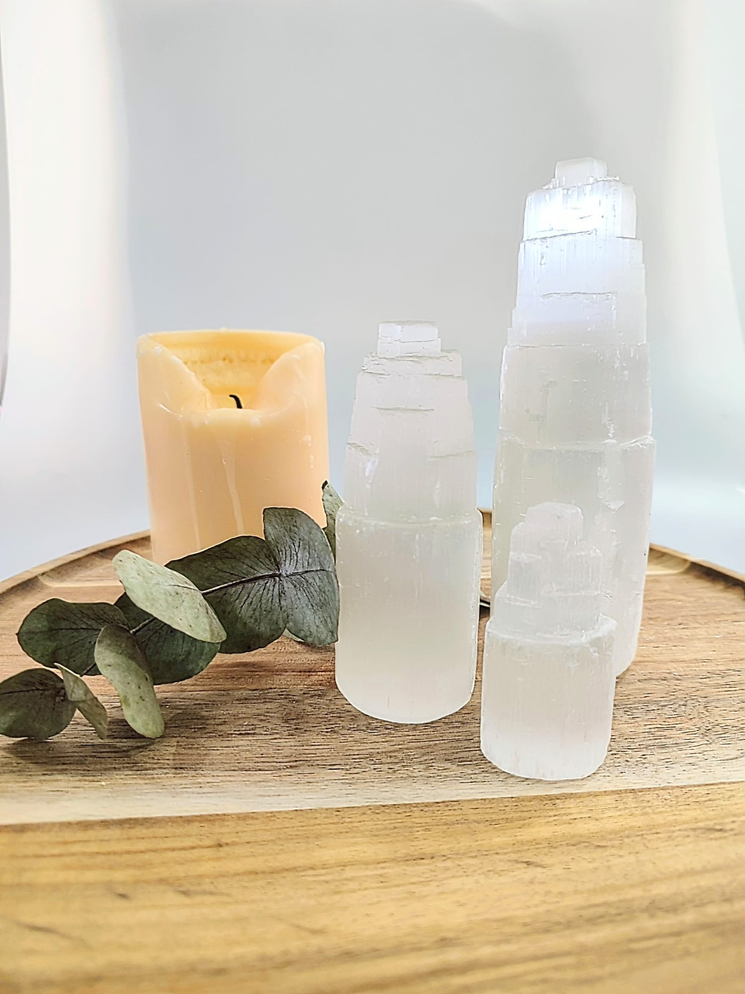 A selenite é ideal para limpar energias negativas, tanto de espaços como de pessoas e outros cristais. A sua forma em torre, apontada para o alto, simboliza a ligação entre a Terra e os planos superiores, promovendo a claridade mental, a paz interior e a harmonia.